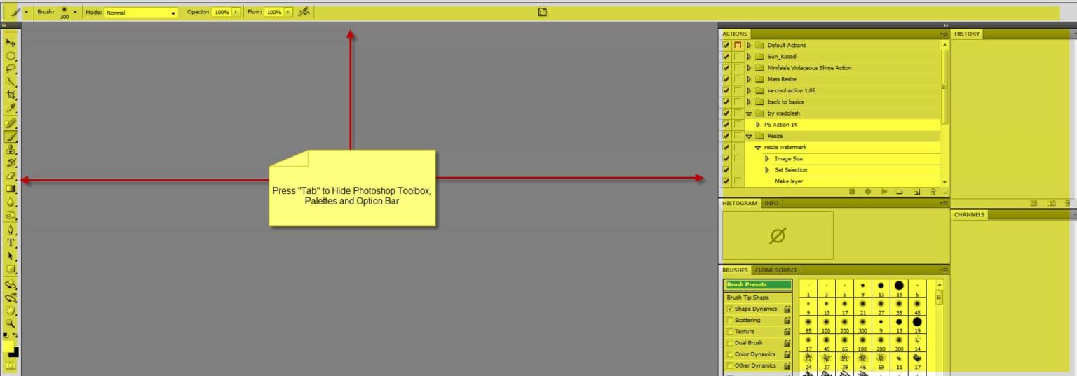 By Default, Photoshop will have a set of palettes and tools open on the left, top and right side of the canvas. Sometimes these can be a little distracting because you just want to see the photo only, nothing else.