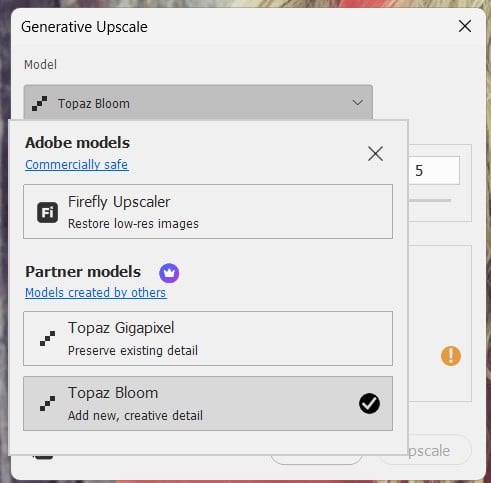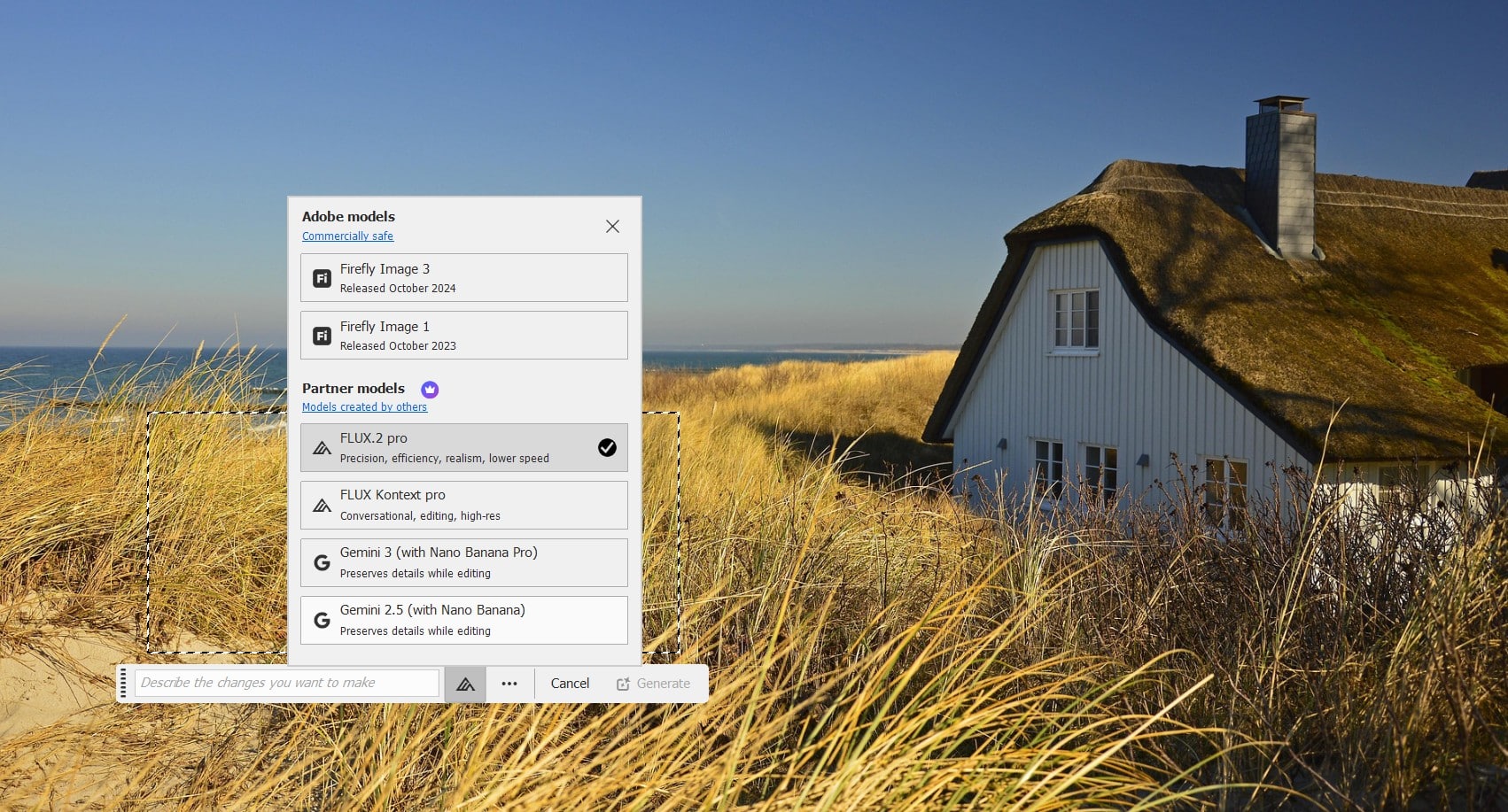 No longer limited to Adobe’s Firefly, you can now select from AI models like Google’s Gemini (Nano Banana), Black Forest Labs’ Flux.1 Kontext, and Topaz Labs’ Gigapixel (and Bloom variants) right within tools like Generative Fill, Generative Upscale, AI sharpen and AI denoise.