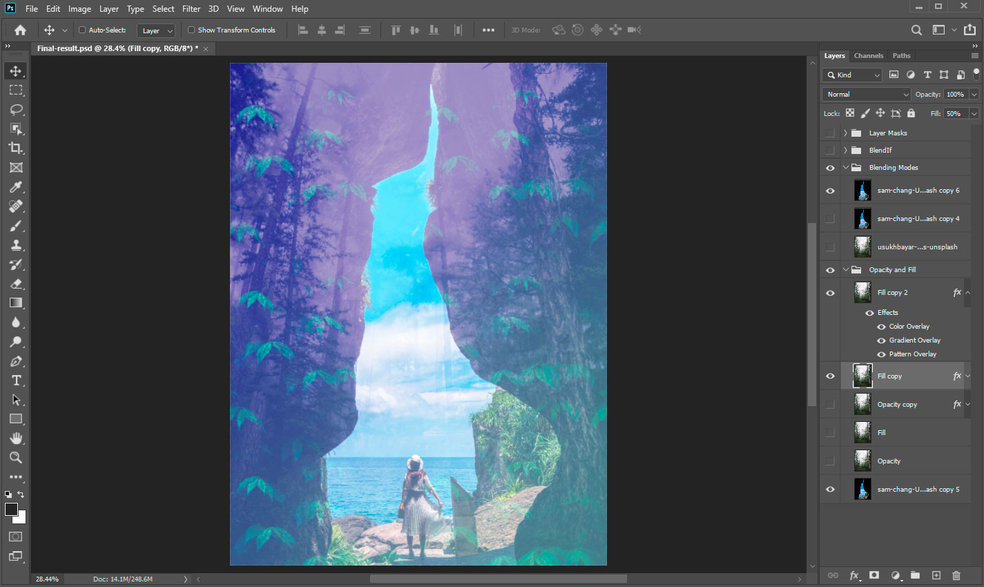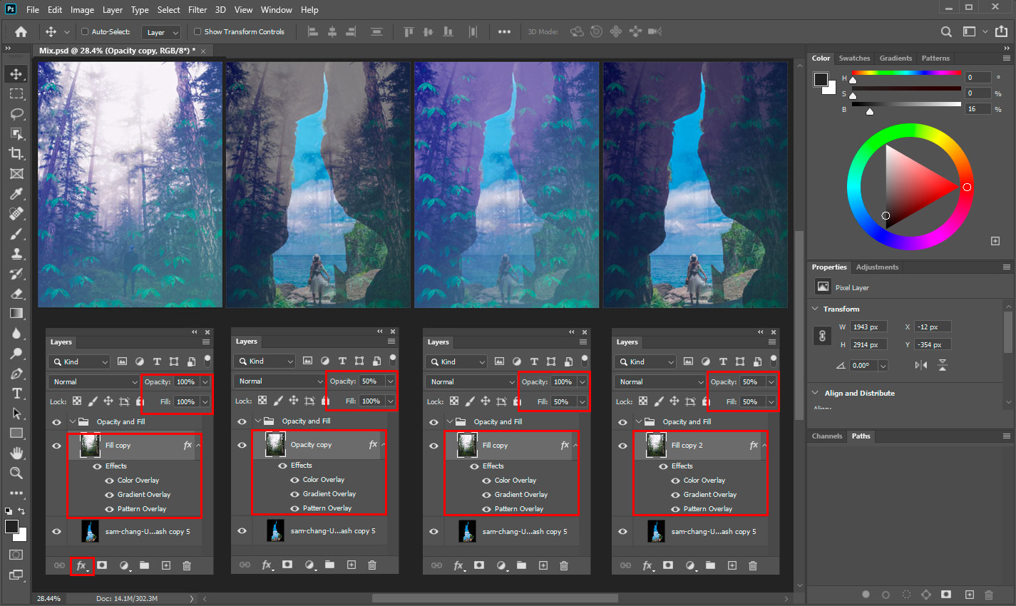 At the top of the Layers panel (Window > Layers), you can find the Opacity and Fill settings. Adjust that value to the desired look, and your images will mix. The Opacity and Fill values control a layer’s transparency. By lowering the value, the layer becomes more transparent. The active layer will fade away into the content below. The bottom layers start to show through.