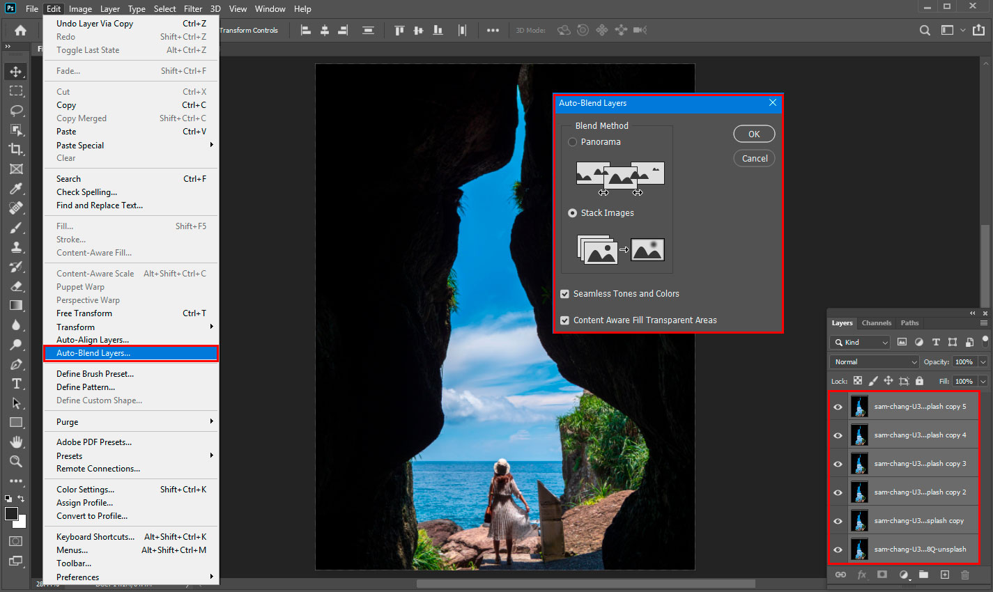 Auto-Blend Layers command (Edit > Auto-Blend Layers) useful if you want to combine a panorama or photoset from several images of the same location/place.