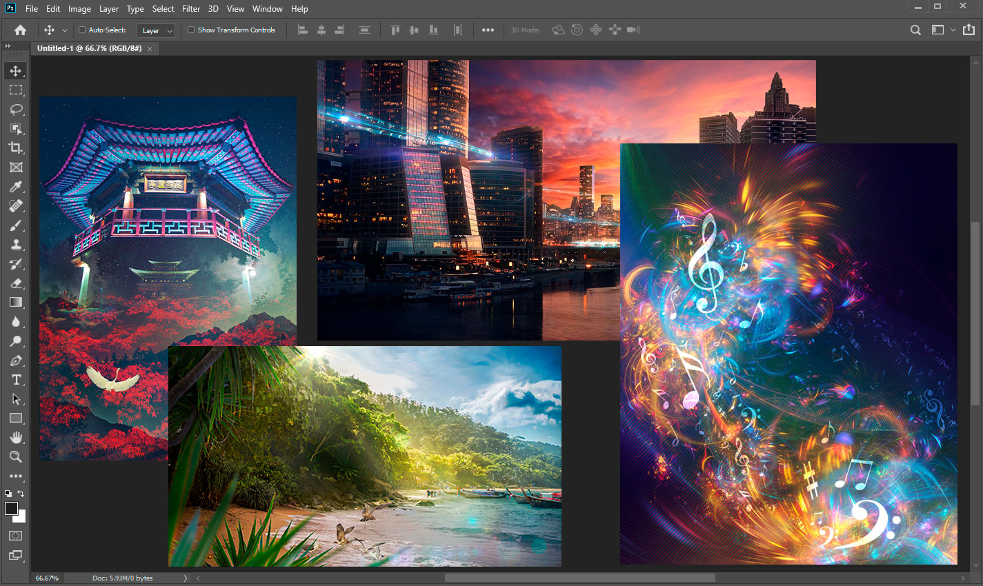 Before you start, we need a little preparation and pay attention to some important features. You can create a new document (Cmd/Ctrl + N or go to File > New) with the desired size and place images (File > Place Embedded) in it. Or, you can open one of them and place another one on the top.