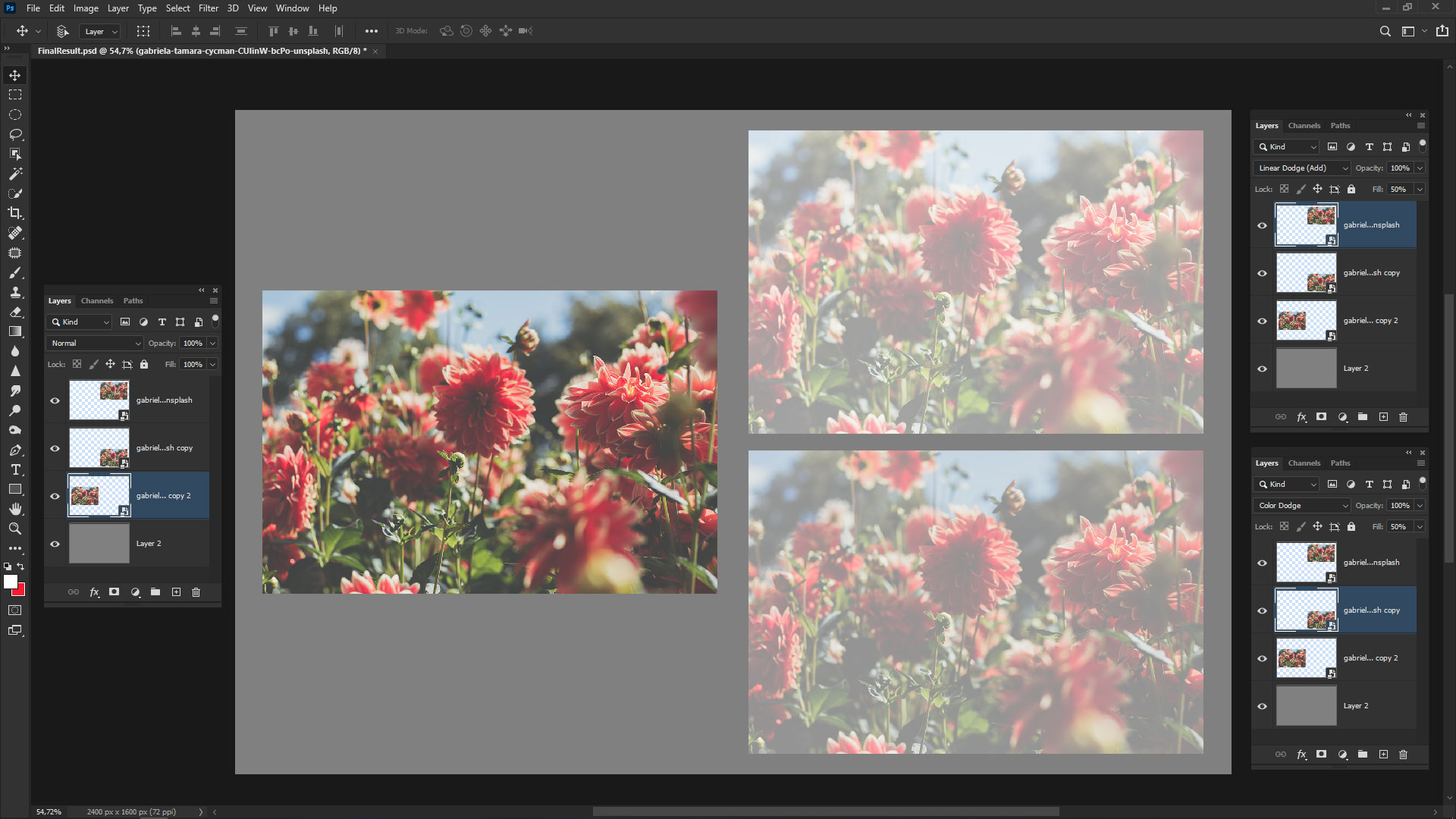Place another image “gabriela-tamara-cycman-CUIinW-bcPo-unsplash” (File > Place Embedded). Scale it proportionally to match the working canvas. Change Blending Mode to Screen. This image blended into the background, complementing it with colours and flowers. Just one layer can change an image’s look and feel.