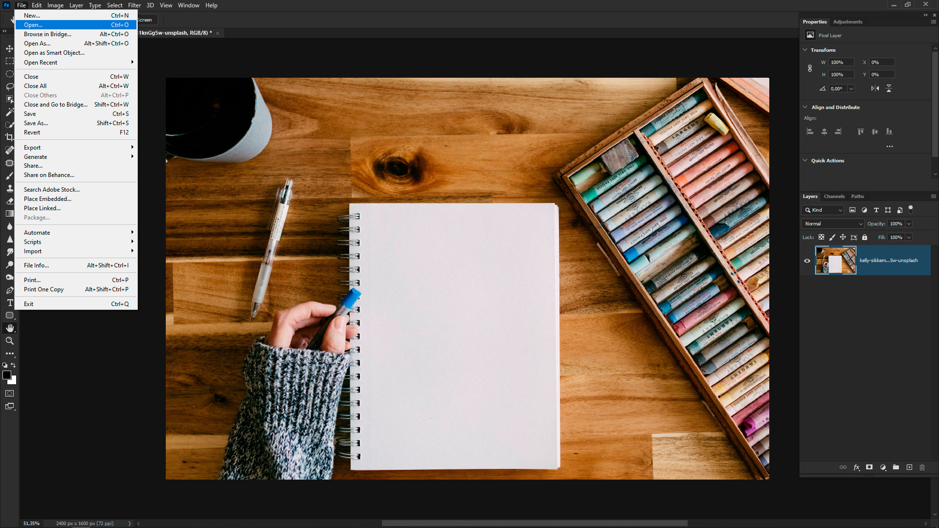 Open the “kelly-sikkema-Skb81knGg5w-unsplash” image in Photoshop (Cmd/Ctrl + O or go to File > Open).