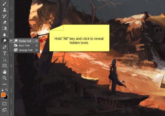 There are hidden tools in almost every tool in the Photoshop toolbox. To reveal them, simply click and hold your mouse and you will see the pop-up window of the hidden tools.