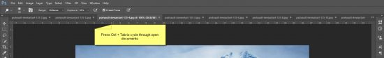 If you’re like me and enjoy having tons of documents & photos opened at once, you will find this shortcuts handy – simply press Ctrl + Tab to cycle through all open documents: