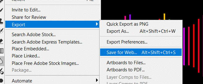 To export: File > Export > Save for Web. This opens the optimiser dialogue.