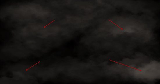 Create a new document sized 1500px * 794px with black background. Use a the cloud filter or a cloud brush, paint some subtle cloud effect around the canvas as shown below: