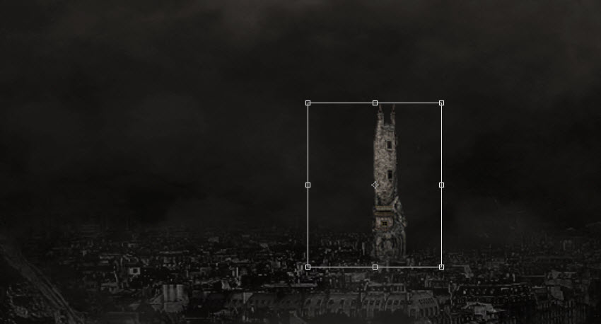 Copy and paste the selection to our document, place it into the following position. Use a soft eraser to fade the top of the city: