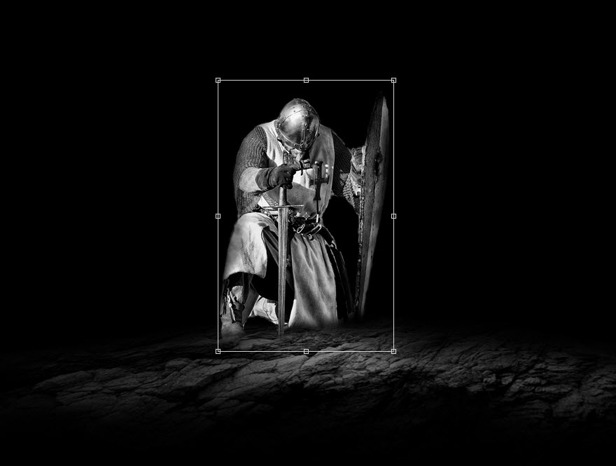 Load the knight stock image into Photoshop, cut out the knight and place it at the centre of the canvas as shown below: