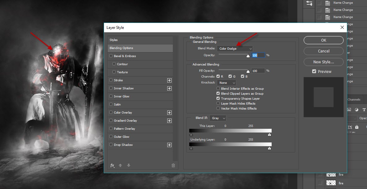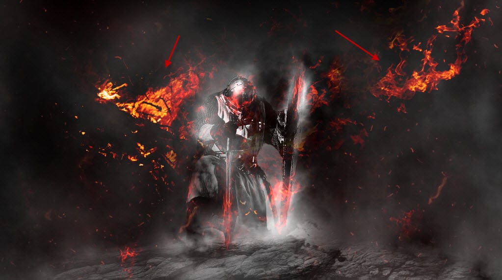 Duplicate this fire layer a few times, attach the duplicated layer to the knight to create a dark energy release scene: