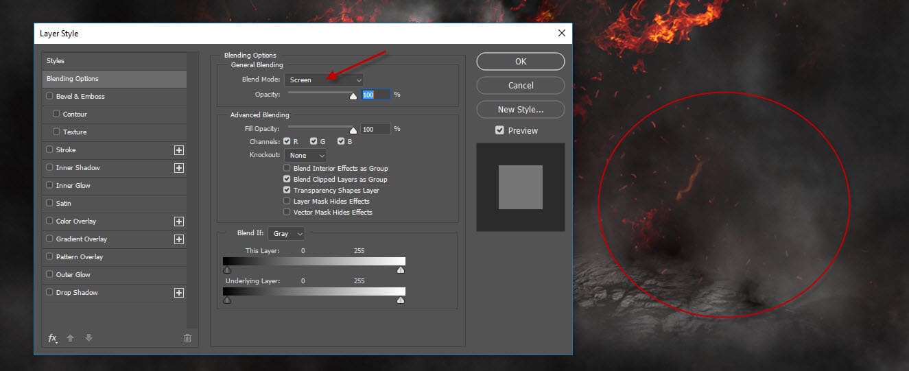 For final touches, we will add some fire sparks around the canvas by selecting this portion from the fire stock image: