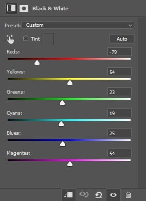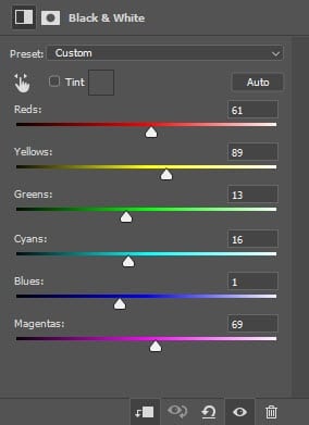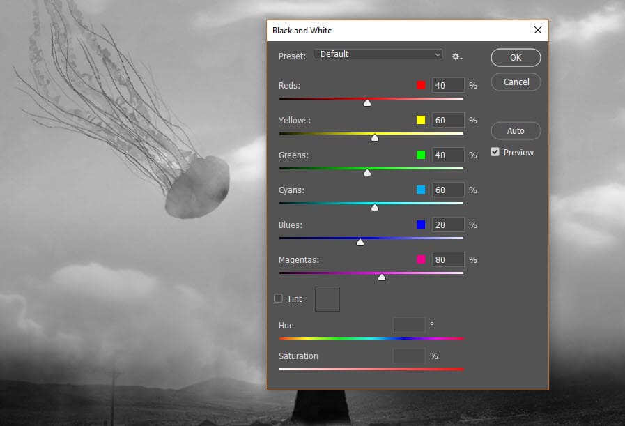 Load the 2x Jellyfish stock images into Photoshop, copy and paste them onto our document. Apply the following Black and White adjustments to them: