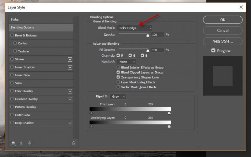 Copy and paste it to our document and set its blend mode to “Color Dodge”: