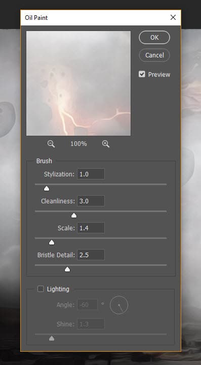 I flattened the layers and made a duplicate of the background layer, applied the following Oil Paint filter to the duplicated layer: