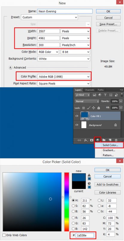 Open Photoshop and create a new document with Width: 3507 pixels, Height: 4961 pixels, Resolution: 300 Pixels/Inch. You can create a new document with Background color #1a538e or (as I prefer more) add it as a Solid Color adjustment layer to have more room for experiments and finding of the necessary shade. Go to Layer > New Fill Layer > Solid Color… or use circle icon at the bottom of Layer panel and set a color to #1a538e. Delete “Background” layer by grab and drop it on the trash icon.