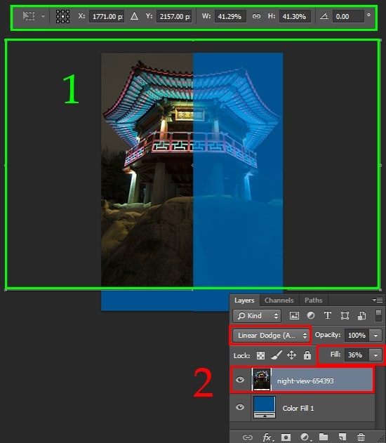 I just want to warn you that in this artwork I will work in a more destructive way, so try to apply all transformations right away, rather than putting a photo into working document first, and then transforming it. Otherwise, the quality of your photo manipulation will drop dramatically. Or use Smart Object layers to make the image content update every time you transform it. Place Temple image (File > Place/Place Embedded) into a working document. Scale image proportionally with Free Transform Tool (Cmd/Ctrl + T or Edit > Free Transform) and fill with temple’s roof almost entire working field (approximately 41.29% for vertical and horizontal scale). Try to find vertical symmetry of the temple relative to the working field. Also, take into account that the photo was taken from a low angle. Therefore it is compositionally advantageous to take as much as possible the upper part of the working field, but leaving some free space. Change layer Blending Mode to “Linear Dodge (Add)” and reduce Fill to 36%.