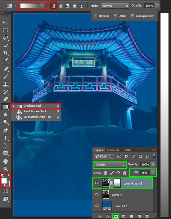 Once everything is aligned, you can start mixing images. Duplicate layer with the temple (Layer > Duplicate Layer or use shortcut Cmd/Ctrl + J) and change Blending Mode to “Overlay”, reduce Fill to 46%. To soften contrast at the bottom part, add a layer mask (use the icon at the bottom of Layers panel or go to Layer > Layer Mask > Reveal All) and take a Gradient Tool (G). Set Mode to “Linear Gradient”, Preset to “Foreground to Background”, reset colors to default (shortcut D key) and set Foreground color to white and Background color to #5f5f5f (37% of gray) on the left Tools panel. Hold down the Shift key to create the perfect vertical line and draw a gradient from the top edge of the working field to the bottom.