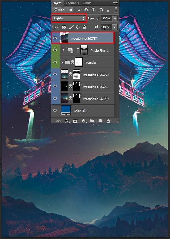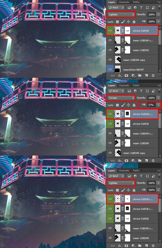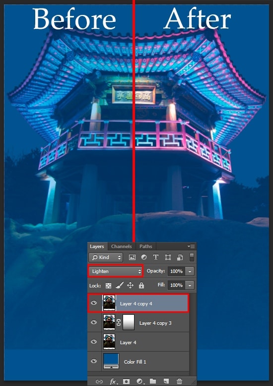 Duplicate the original layer again (Cmd/Ctrl + J) and move it to top of Layer panel. Change Blending Mode to “Lighten” and restore Fill and Opacity to 100%. This Blending Mode will help to show the brightest areas on the dark places and restore the red hues over the decor of the temple. So, it gets a pretty modern, beautiful and neon look. Of course, you can use just one layer with the mode that you like, but as I mentioned earlier, it’s all about the details and experiments. So, it seemed to me that the result from blending several layers saves a wider color gamut and shows more details.