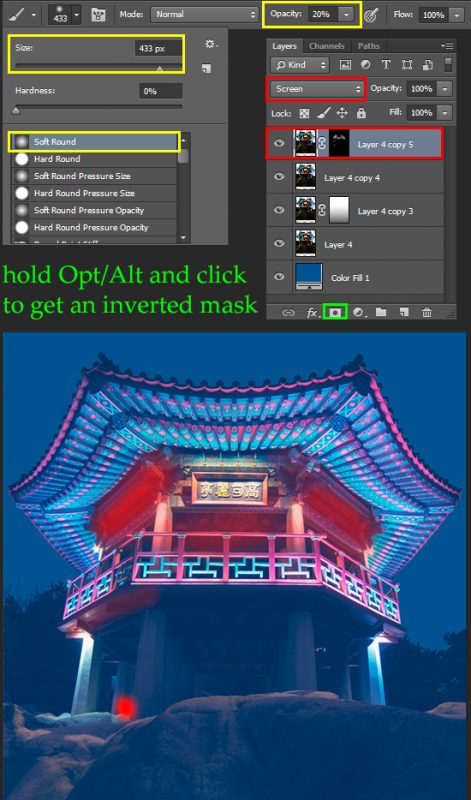 It remains to create one more copy of the temple (Cmd/Ctrl + J) at the top of the layer stack and use Blending Mode “Screen” (Opacity and Fill – 100%). Add a black layer mask (hold Opt/Alt and click on layer mask icon or go to Layer > Layer Mask > Hide All) to hide the entire layer. Restore lighting on the decor elements, where details are less visible on upper part of the temple with Brush Tool (B). Setup brush like this – Soft Round preset, Size: 180-575px, Opacity: 20%, color: white.