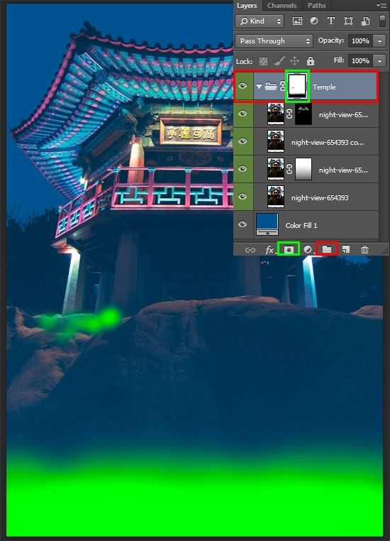 Group all these layers (Cmd/Ctrl + G or go to Layer > Group Layers), except color fill layer and add a layer mask to a group (Layer > Layer Mask > Reveal All). Take a Brush Tool (B) with the settings from the previous step but with Opacity: 100%. Blend bottom hard edge of the photos with solid color background and remove rocks near the temple’s pillar on the left side.