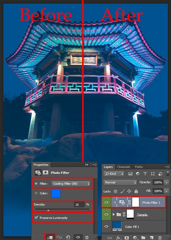 With “Photo Filter” adjustment layer (Layer >New Adjustment Layer > Photo Filter… or use the icon at the bottom of Layer Panel) I add more blue color, remove the parasitic shades of green from the temple and lighten a bit dark areas. On Properties panel set Filter: Cooling Filter (80), Density: 25% and checkmark “Preserve Luminosity”. Make Clipping Mask from that layer to a group (Cmd/Ctrl + Opt/Alt + G or use the icon at the bottom of Properties panel) to affect only on images and not background color.