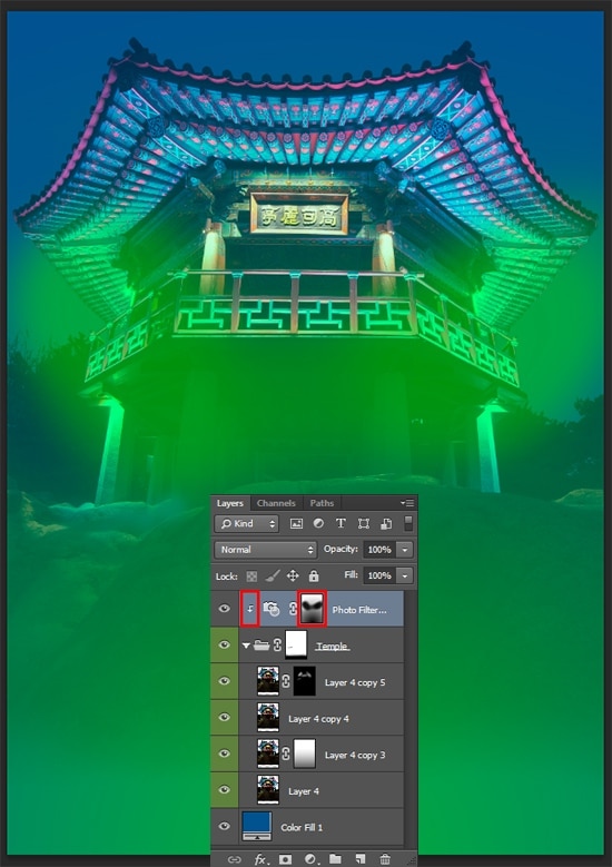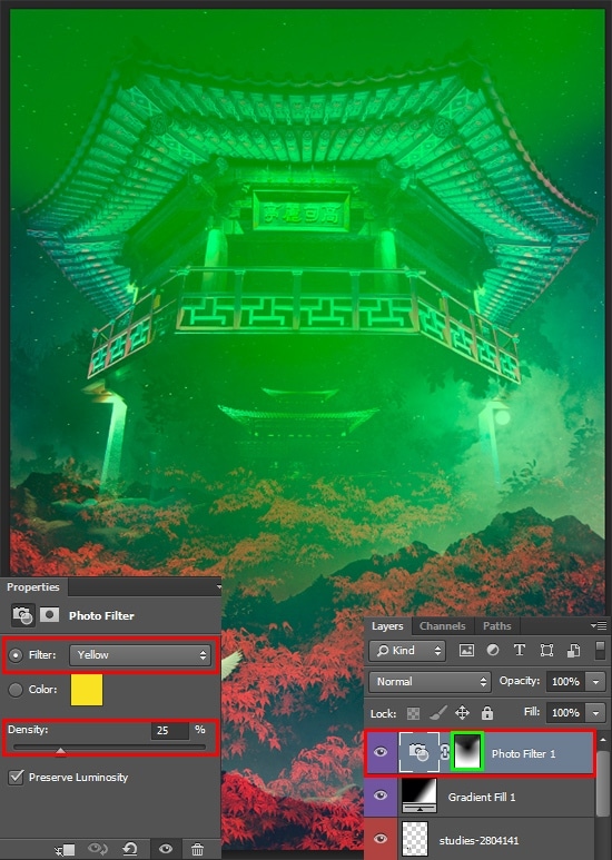 Add “Photo Filter” adjustment layer (Layer >New Adjustment Layer > Photo Filter… or use the icon at the bottom of Layer Panel) with the settings – Filter: yellow, Density: 25%. This will help to more integrate all parts of the picture and expand the range of green tones at the bottom. Also, add more warm tones to the overall atmosphere. On a layer mask, remove effect completely from the temple but leave it a bit on the edges and at the bottom part of an artwork. Use Brush Tool (B) (Soft Round preset, Size: 2000px, Opacity: 50-100% and black color).