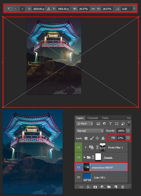 Now it’s time to add details to the background so it wouldn’t be so boring. We will use the starry sky and then the mountains from the same image. Let’s start with the simplest – the starry sky. Place an Landscape image into the working document between a solid color layer and group with the temple. In Free Transform mode (Cmd/Ctrl + T), scale image a bit bigger than working area and locate it, as shown in the image below. Reduce layer Fill to around 57% so a little bit of texture affected on the background.