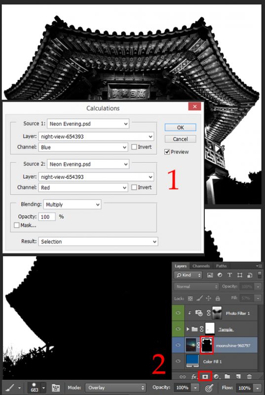 To remove the stars on the temple image, you need to create a selection of that area. Best and quickest solution to do that is going to Image > Calculations. In the window that appears set both sources to temple layer (night-view-654393), Source 1 channel: Blue, Source 2 channel: Red, Blending: Multiply and Result: Selection. After the selection is created, add a layer mask (Layer > Layer Mask > Reveal Selection), hold Opt/Alt and click at layer mask thumbnail to show mask’s content. Take a Brush Tool (B) with Hard Round preset, Size: 500-1000px, Blending: Overlay (for gray tones) or Normal, color: black. Clear mask from gray objects, until you get the hard/sharp silhouette of the temple. Hold Opt/Alt and click again on the thumbnail to exit mask editing mode.