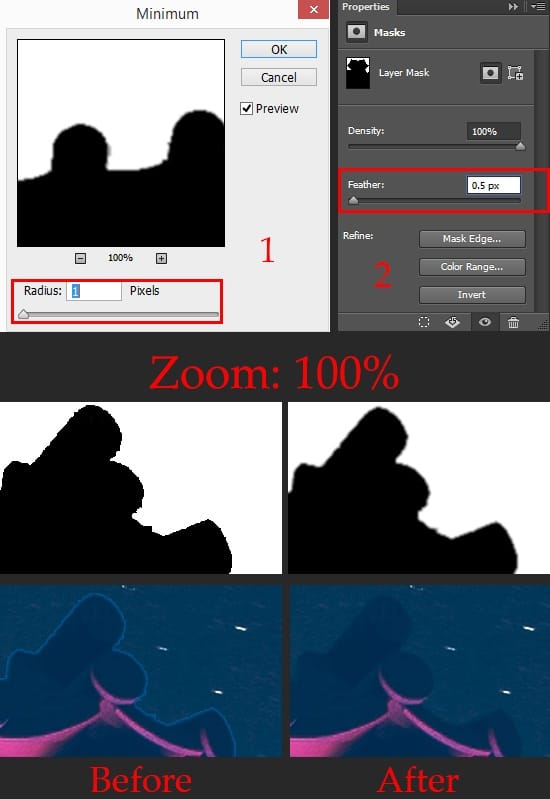 If you want to improve the selection even further, then there are a few additional steps. First, apply “Minimum” filter (Filter > Other > Minimum…) with Radius: 1 pixel to remove white matte (white stroke/halo around selection). In the newer version of Photoshop, you can specify fewer numbers. Next, make double click on layer mask thumbnail to get into mask properties. Set Feather: 0.5-1 pixels and that it! The Settings depending on how much you want to make the edges of the mask softer. There is a relation between the details of the mask and the hardness of the edge, so do not overdo it with the setting. Not to smooth the edges too much so the removed content does not appear again. Also, if you apply a layer mask to the layer (Right click on mask’s thumbnail > Apply Layer Mask) you can use Matting options from Layer > Matting. This is a more destructive method of work, but it has the advantage that with this approach the size of the working file is much smaller.