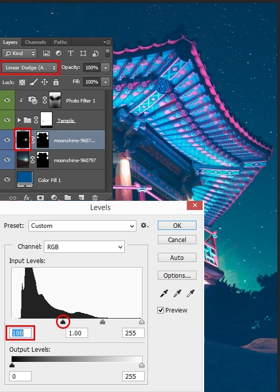 Since we work with the “Lighten” group of Blending Modes, it is easier to control the details and blending using the same tools. Change Blending Mode to “Linear Dodge (Add)” to better see the problem areas and mix the photo with the background. Use “Levels” adjustment (Cmd/Ctrl + L or Image > Adjustments > Levels) to find a suitable ratio of dark and light so that the photo blends harmoniously with the composition. Start with blacks until the borders of the photo are disappear. Control the details and it’s intensity with the other two sliders. Here it is more about how you choose the settings to your taste.