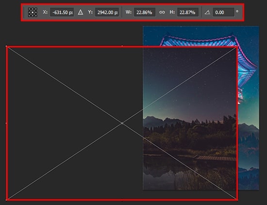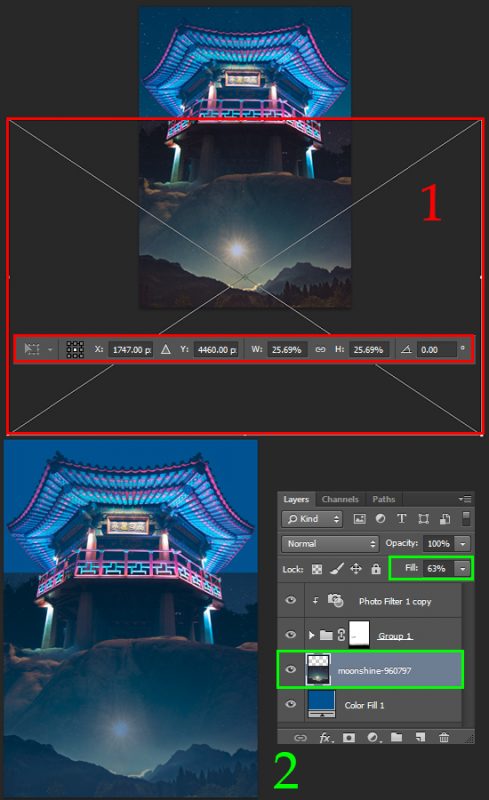 Next, we will start working on the bottom part of our artwork and create a landscape on which the temple is located. Place an Landscape image again in the working document. At the stage of transformation, you need to observe the landscape and find a beautiful, dynamic fragment in it to put it in the foreground. You can change Opacity, Fill and Blending Mode while working with transforming tools, so use it in your work, because it is so much easier and faster to make decisions regarding the construction of the composition. Apply transformations and reduce layer Fill to around 63%.