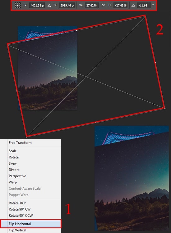 Add another layer of mountains to cover the elements of the previous photo and expand the composition. If you look closely at the photo, you will see that you can push off from the idea of the mountains and use the lake, for example. So you can develop the plot a little differently. Place a Landscape image again. In Free Transform Mode make right click on the photo and transform it as shown in the image below. Try to hide the highlight outside the working field, otherwise, it will be the most visible object. We are interested in a beautiful glow from the starry sky, the light sources will be a little later.