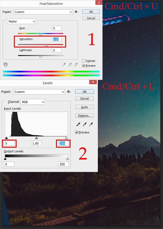 To enhance the photo you can use adjustments such as “Levels”, “Curves”, “Hue/Saturation” or simply “Brightness/Contrast”. I made the image more saturated and added a bit of contrast so that it blends better with the background. You can even change the hue of the shine or even make the entire image a monochromatic. But this is not entirely necessary. The desired settings from my result, you can see in the image below.