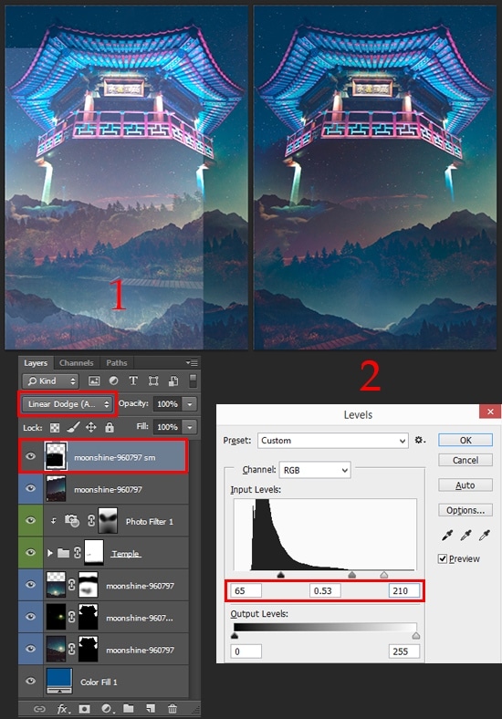 So, the mountains are all in place. Now it is time to integrate all the pieces of the landscape, hide some inaccuracies of the landscape and blur the transitions between the plans. I chose this photo because I liked the contrast between the leaves and the moon. Interesting shape and texture of fog will be a good working material in all respects. First, add the light source by placing Moonshine image into working document and in Free Transform mode (Cmd/Ctrl + T) resize an image and locate the moon on the right side of the temple, over or near the lantern. The additional brightness of this place will help the object better fit into the overall atmosphere. This time it handy for textures to affect the whole range of brightness, so for this layer use “Screen” Blending Mode.