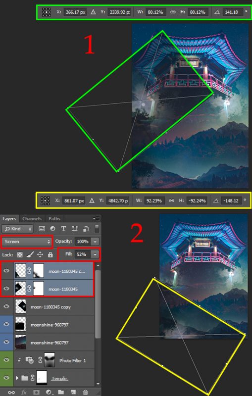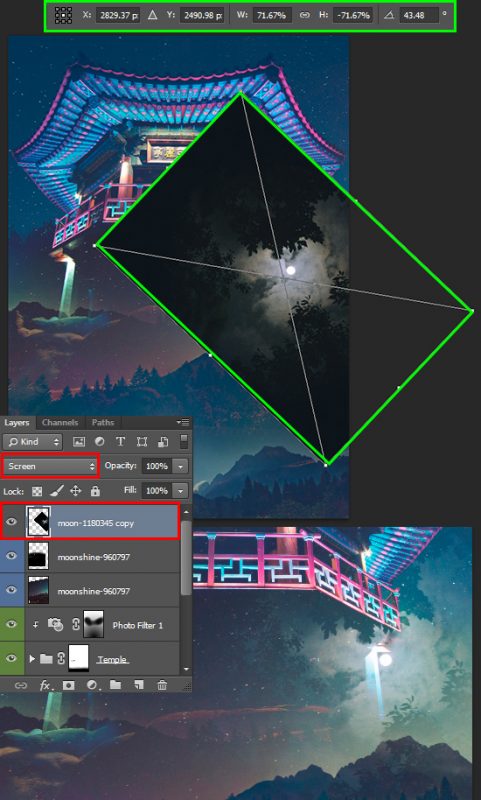To add more details, duplicate this layer (Cmd/Ctrl + J) and change Blending Mode to “Screen”, reduce Fill to 57%. Duplicate the original layer of the temple one more time (Cmd/Ctrl + J). Scale it down with Free Transform Tool (Cmd/Ctrl + T) and use the Move Tool (V) to locate is above the previous image to add even more complexity to the whole structure.
