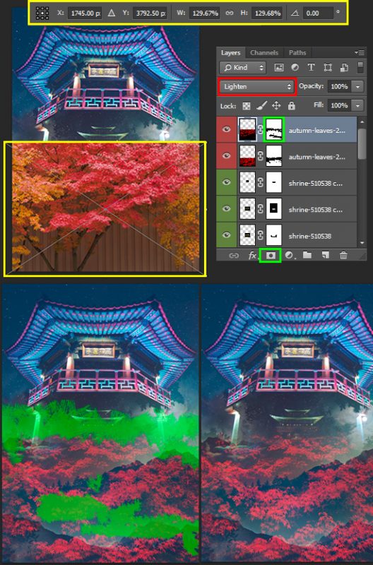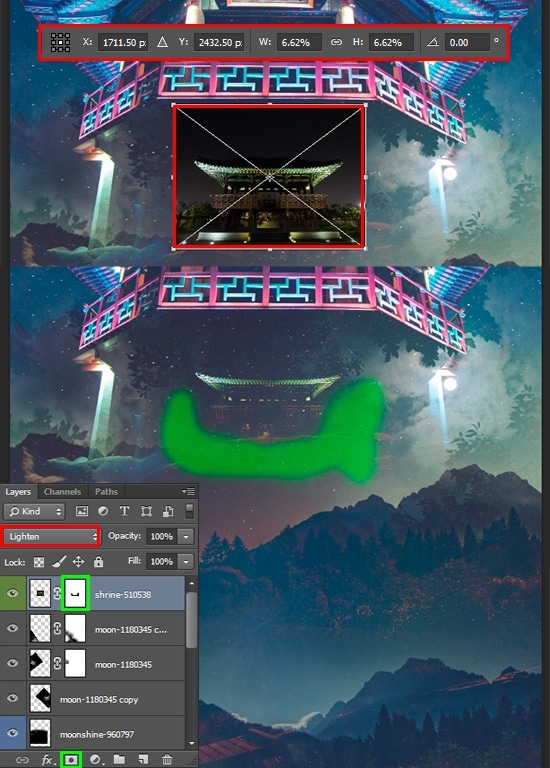 I decided to add more details to the temple to emphasize the contrast between the size of the temples. The roof will not look so impressive if we have nothing to compare with. In addition, a small luminous detail in the depth will add mysteries and riddles to the image. All the same as with the previous steps. Place a Shrine image, reduce it’s scale so that the image fits under the temple, placed on rocks (do not levitate!) and its details do not cover the pillars. Change Blending Mode to “Lighten” and use a layer mask with the Brush Tool (B) to remove distracting and unnecessary objects at the bottom of the temple.