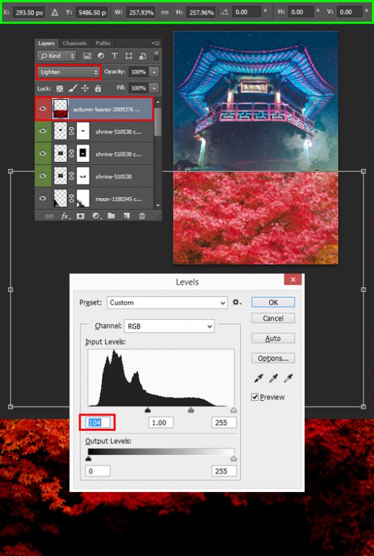 Now add the foliage. We need two layers with different scales to keep the proportions in the image. First, place Leaves image and resize it, as shown in the image below. Put foliage in the foreground. Secondly, set Blending Mode to “Lighten” and use “Levels” adjustment (Cmd/Ctrl + L or Image > Adjustments > Levels) to darken the background of the leaves until it disappears, thereby leaving only the brightest foliage.