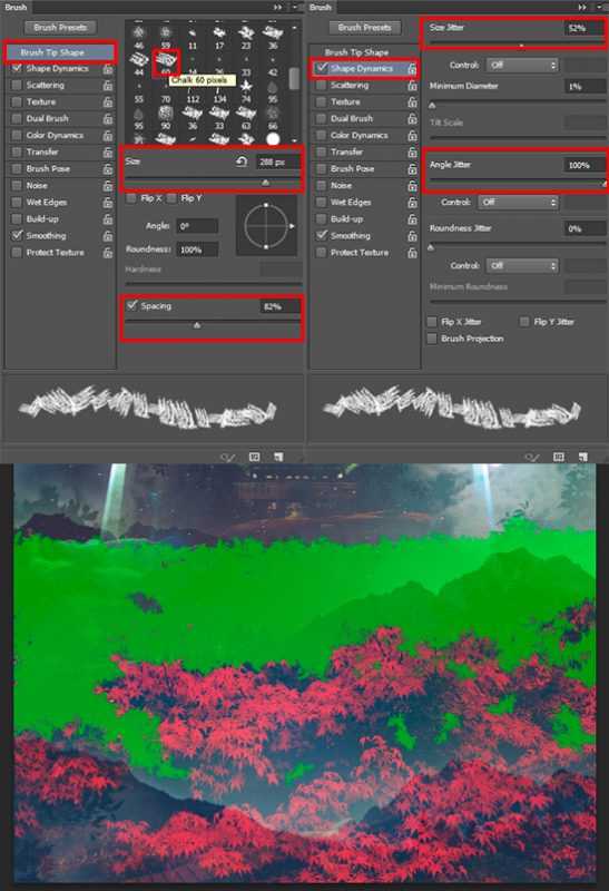 To mix the foliage a simple round brush will not be enough. No matter how carefully you try, it will be long and not very realistic. It’s all about the abstract edge, which leaves no hint of editing, and the mask remains realistic. Use the images below to create a similar brush. All settings and presets you will find in Photoshop itself. Go to Brush Panel (F5) and use a “Chalk 60 pixels” brush preset as a starting point. I often use this kind of brushes in my work when dealing with vegetation. This brush helps a lot when you need to make a mask for trees or similar foliage. When you customize the brush, add a layer mask to foliage layer ( Layer > Layer Mask > Reveal All ). First, hide the image border, then remove areas that are mixed incorrectly or foliage hide an interesting part of the landscape.