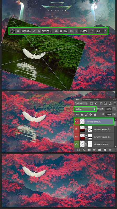 To enrich the plot and composition, let’s add an expressive object to the foreground. So we will add additional dynamics and one more bright spot will be added as a balance to the moonlight. Place image of the bird (File > Place/Place Embedded) into a working document. While in Free Transform Mode (Cmd/Ctrl + T), first of all, flip an image horizontally (Right click > Flip Horizontal). Next, scale it to around and position at the bottom part of our artwork. Rotate bird a bit to catch dynamic and direct the movement towards the light source. Change Blending Mode to “Lighten” and with Brush Tool (B) on a layer mask or with Eraser Tool (E) remove all green background to separate the bird. Be attentive to details in order not to accidentally remove important parts of the bird. Play with the composition. At this stage, you can get a lot of interesting stories.