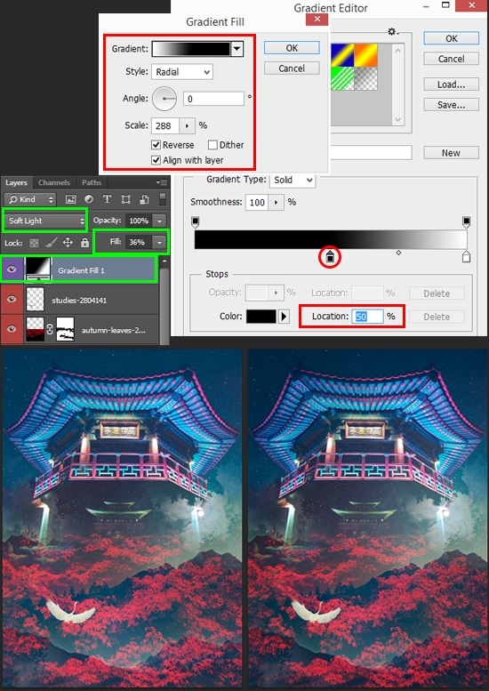It is necessary to bring the lighting of our picture to a single source so that the details do not seem disconnected. The moon and neon roof is our main light spots in the scene, so we need to put all attention on it. apply “Gradient Fill” adjustment layer (Layer > New Fill layer > Gradient) with gradient settings like Mode: Radial, Angle: 0 degrees, Scale: 288%, Reverse. Click on Gradient to show up “Gradient Editor” window and move black slider to Location: 50%. While “Gradient Fill” window is active drag and drops white spot near the moon. Set Blending Mode to “Soft Light”, Fill around 36% to make the vignette not so noticeable. We are interested more in lighting to emphasize the light source.