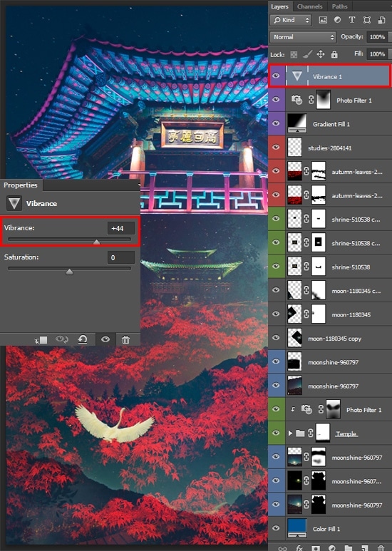 The last thing to add is a touch of color. Add “Vibrance” adjustment layer (Layer >New Adjustment Layer > Vibrance) and set Vibrance: +44. You can also clean up a bit in your working document to reduce its size. To do this, delete all unused layer masks. Also, if you added layers not as smart objects, you can use Crop Tool (C) and without changing borders checkmark “Delete Cropped Pixels” and apply the crop. This deletes all the information what was outside the working field.