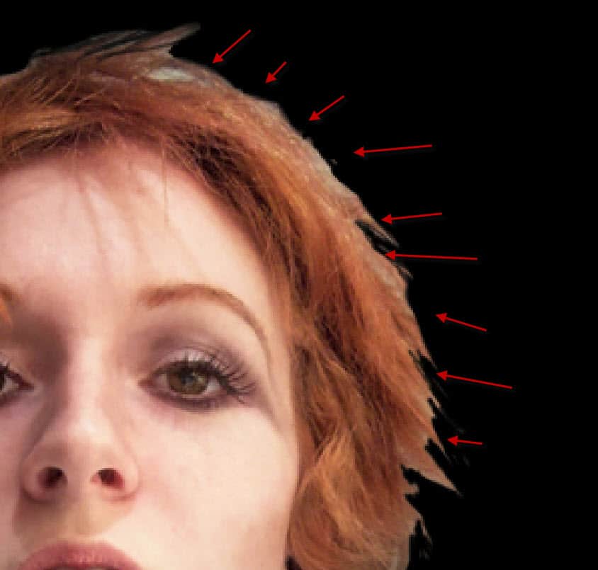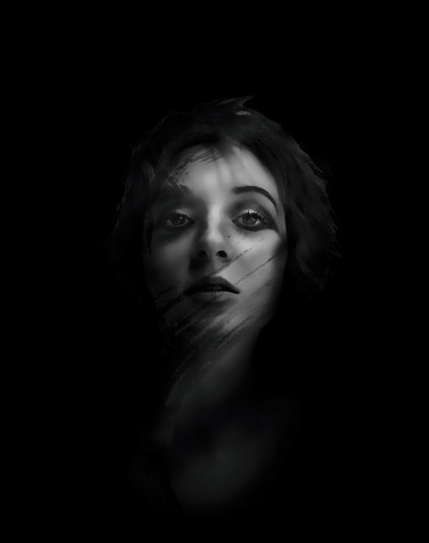 Create a new document sized 800px * 1020px with black background, load the model image into Photoshop and cut of the head and shoulder portion of the model, paste it onto our document. Resize and position this layer to the centre, and use a soft eraser to fade the edges as shown below: