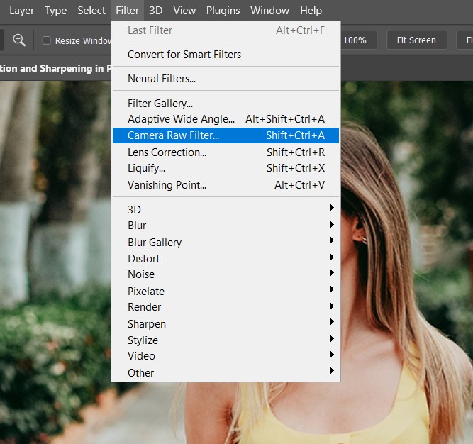 - Navigate to Filter > Camera Raw Filter. This opens the Camera Raw filter workspace.