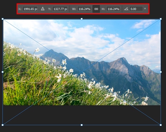 In Free Transform Mode scale image and position it so the width of the photo filled the entire working area (around 116.24% for vertical and horizontal scale). Leave a small image margin outside the edges of the working field. In terms of composition, is advantageous to use most of the sky than the hill.