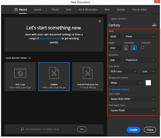 Let’s start from opening Photoshop and creating a new document via File > New or use keyboard shortcut Cmd + N (Mac) / Ctrl + N (Win). In dialog box set Width: 4000px, Height: 2162px, Resolution: 200 Pixels/inch, Color Mode: Adobe RGB (1998). The aspect ratio of this document is 1.85:1 like for concept art. Go to File > Place Embedded and specify a path to Mountains Landscape image on your drive.
