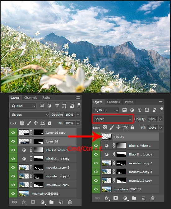 Repeat the previous two steps to add more clouds, near the previous layer. The organic texture is good because its size and scale are relative. But still, do not neglect the details. So, play around with the number of layers or settings. When done with the clouds, you can merge all these layers into one via Layer > Merge Layers or Cmd/Ctrl + E. With that be more convenient to work. And do not forget to return the blend mode back to “Screen”.