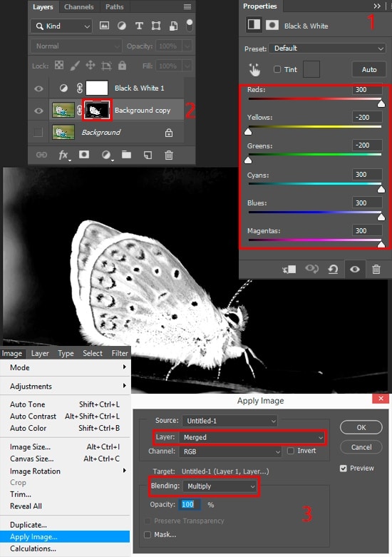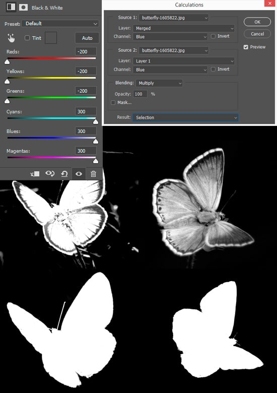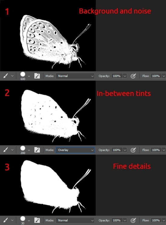 Now a bit of work. I used a Brush Tool (B) with Size: 40-300px, Opacity: 100%. Switch between “Normal” or “Overlay” brush blend modes to faster and better make a mask. Also, it is useful to use a Hard Round brush. All the gray tones on the butterfly need to be white. All dark areas that the previous brush failed to do, paint it with white on “Normal” blend mode. Entire background needs to be black. Check all the details of the butterfly, especially the legs. In the gray areas, the shadow of the leg can often disappear and an unnecessary background appears. Achieve a strong contrast and make sure that no noise of the opposite color on the butterfly or background.