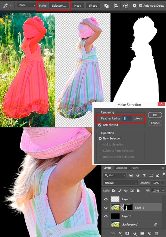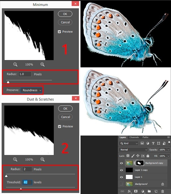Improve the edges of the mask. To do this, apply several filters and the first is the “Minimum” (Filter > Other > Minimum) with the Radius: 1px, Preserve: Roundness. To make the edge softer, apply Filter > Noise > Dust & Scratches with the Radius: 1-2px, Threshold: 0-40 levels. Usually, to assess the quality of the mask and identify the flaws, I create two layers of pure black and white. Examining the edges of the masked object different background helps me to better understand if there is a light glow around the object and what are the disadvantages of the mask. You can try this too.