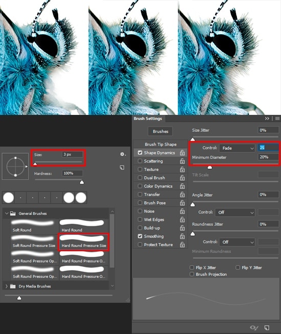 The butterfly is quite fluffy and the mask does not show the edge of the hair. You have to manually restore the fur to make it more realistic. If you are the owner of the tablet, it is not difficult. Use Hard Round Pressure Size brush preset with Size: 1-3px, Opacity: 100%. Or, you can customize brush and work with the mouse. On a new layer (Cmd/Ctrl + Opt/Alt + Shift + N), select color samples with Eyedropper Tool (I) near the place where you want to add hairs. You can hold Opt/Alt to quickly switch between tools. Make small strokes in the direction of the fur. The technique is more calligraphic than hatching.