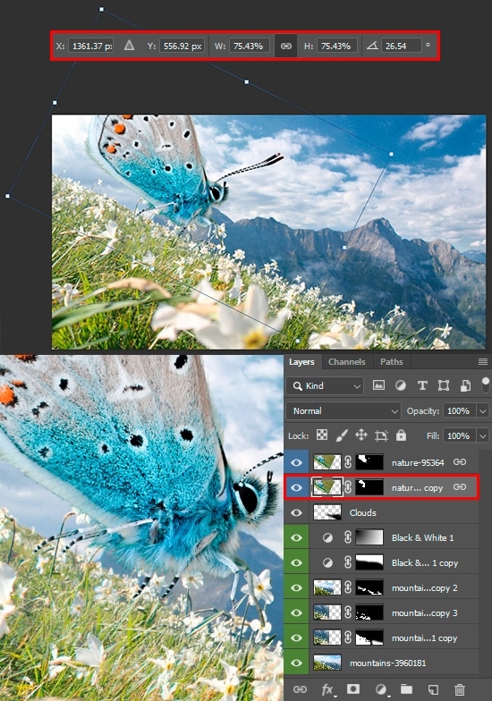 If you are satisfied with the result, hide all the layers except the butterfly and hair, so that the background becomes transparent (a chessboard). Save your render (File > Save As), just in case. Optional, merge both the layers (Layer > Merge Layers or Cmd/Ctrl + E). With Move Tool (V) drag and drop the butterfly into our working document with the artwork. Note that this layer is not a Smart Object. With Free Transform tool (Cmd/Ctrl + T), scale and rotate it so that it matches the direction of the hill. Duplicate butterfly (Cmd/Ctrl + J) and place this layer below previous. Move or rotate it a bit to add the missing two side legs. On the layer mask remove everything else, leaving only the legs.